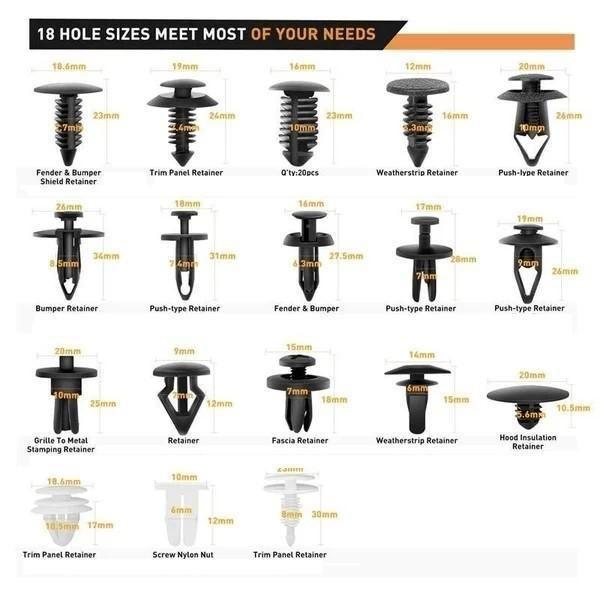 - WORKS FOR ALMOST ALL SITUATIONS - The kit contains 18 types of most common sizes of fastener clips, suitable for the OEM replacement in 6-10mm hole sizes, that you’ll always have the right size.